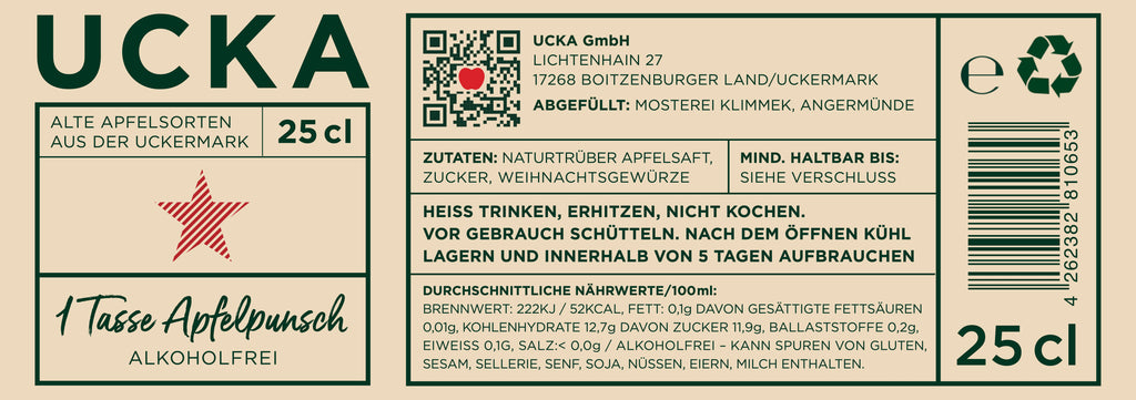 Direkt aus der Uckermark: Unseren naturtrüben Apfelsaft von alten Streuobstwiesen-Sorten haben wir mit fein abgestimmten weihnachtlichen Zutaten in einen alkoholfreien Punsch verwandelt.